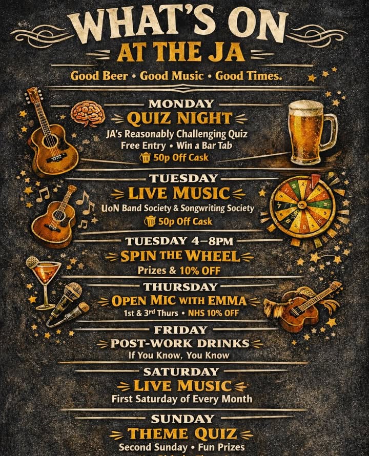 🎶 Tuesdays bring live music every week with the UoN Band Society & Songwriting Society, plus 50p off cask to keep things flowing.