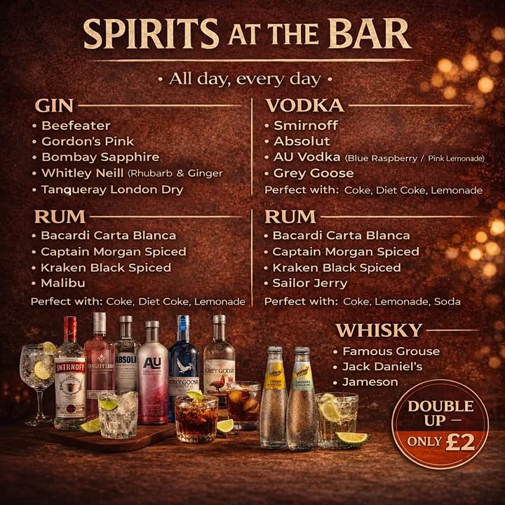 Whether you’re a gin and tonic loyalist, a rum and coke regular, or you like your whisky done right, we’ve got your glass waiting at the bar. Familiar favourites, good company, and the kind of atmosphere that never goes out of style.